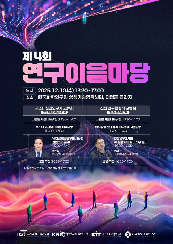 국가과학기술연구회(NST)는 오는 10일 한국화학연구원 디딤돌 플라자와 상생기술협력센터에서 한국생명공학연구원, 한국화학연구원, 국가독성과학연구소 공동주관으로 ‘제4회 연구이음마당’을 개최한다고 밝혔습니다.